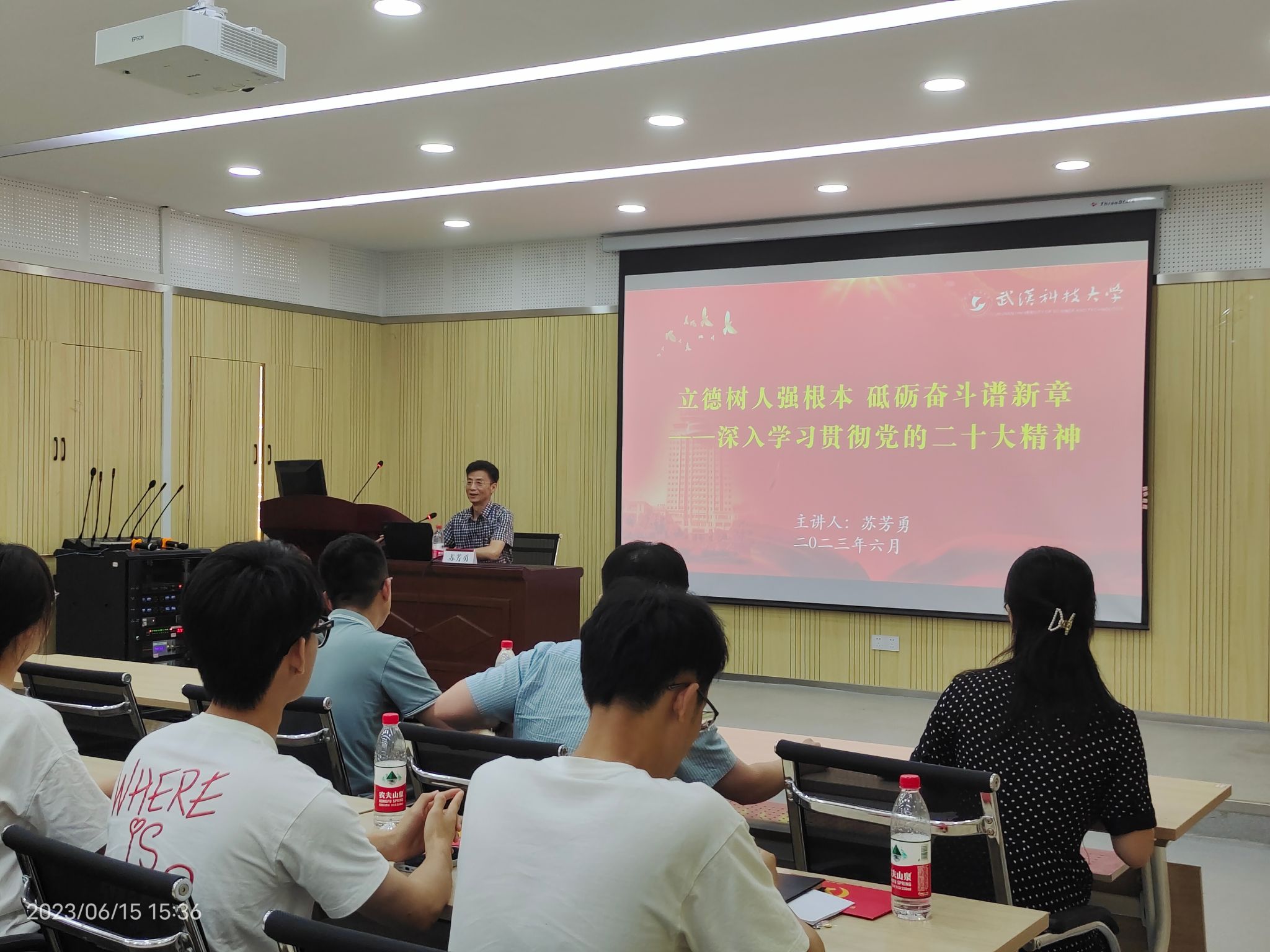 苏芳勇从深刻认识新时代的伟大变革与伟大成就,中国共产党的使命任务和武科大的责任担当以及在推进中国式现代化中展现武科大作为三个方面深入讲述了此次专题党课。他首先从十九大期间,国之重器如歼20、运20、空间实验室等相继问世,展示过去五年的我国的伟大实践。随后在讲到中国式现代化给学校高质量发展带来重大战略机遇时,苏芳勇结合生活实际,谈到公司新增计算机科学学科进入ESI全球排名前1%,黄家湖校区入选全国最美校园等切实发展。最后,他借服务新发展格局背景下的武科大使命,指出新时代青年的使命与担当,对在场全体毕业生及部分积极分子寄予厚望。