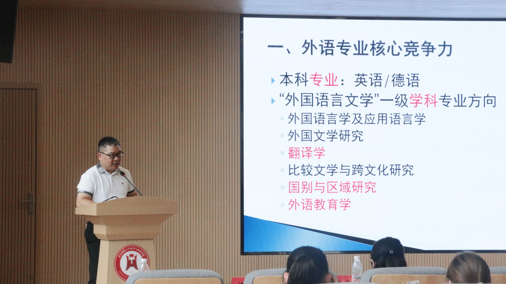 陈尧围绕外语专业的培养理念,从专业学科关系、核心方向、方案调整与竞争力四个方面展开解读。在培养方案优化上,他介绍英语专业新增三个方向,“第二或第三学期开始分流,核心课程各方向共有且可互通”;德语专业则大幅增加英语教学课程,由原来的3-4门、7学分增至6门、10学分,以实现德语与英语能力的协同发展。