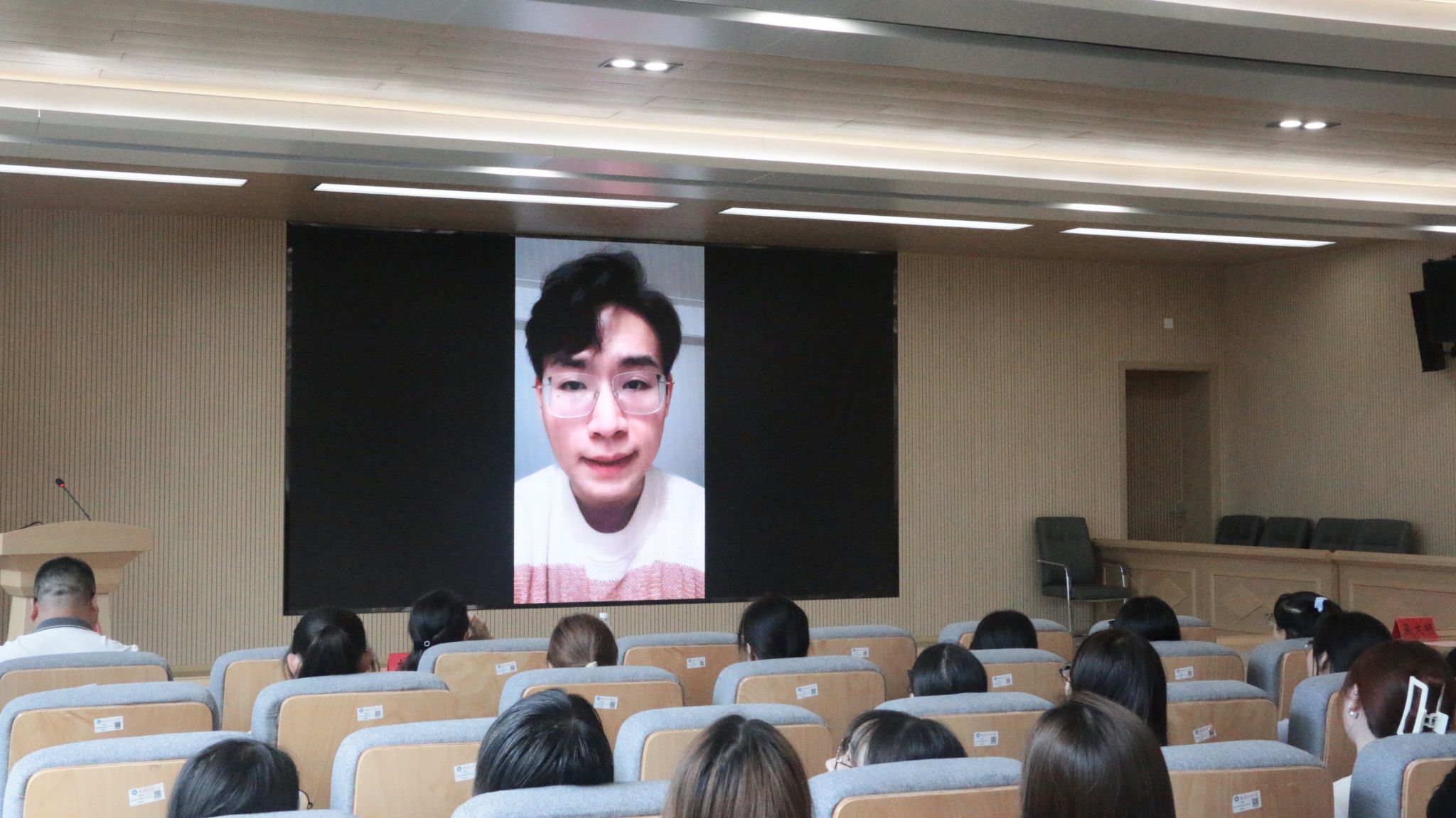 林昊通过视频连线分享了自己的专业成长故事。他笑称曾有“中文、英文、德语考试混杂折磨大脑”的感受,但也坦言,处理文化差异的过程“打开了大脑”,使他逐渐形成全局视野。结合就业与创业经历,他建议新生:“无论你做什么、去哪里,一定要走出去,用世界的语言来体现自己——这可能是一生受益的事情。”
