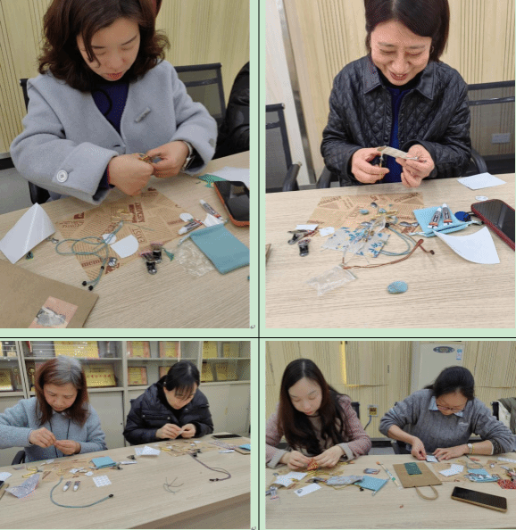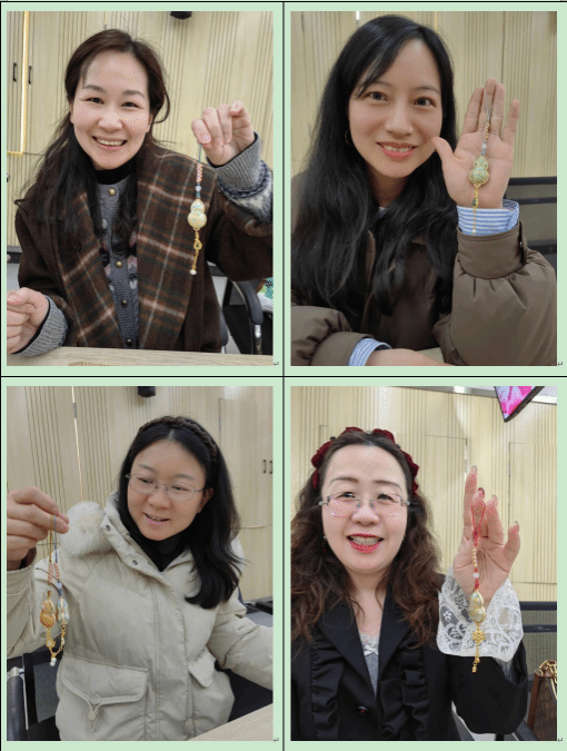 经过一个多小时的精心制作,女老师们亲手制完成了富有节日气息的新中式手作饰品,包括宋锦手机链与项链,手机链有葫芦、蝴蝶两种款式,项链则有葫芦、蝴蝶、四叶草、小马等四种造型。看着自己亲手打造的作品,老师们爱不释手,纷纷拿着成品合影留念,记录下这美好瞬间。